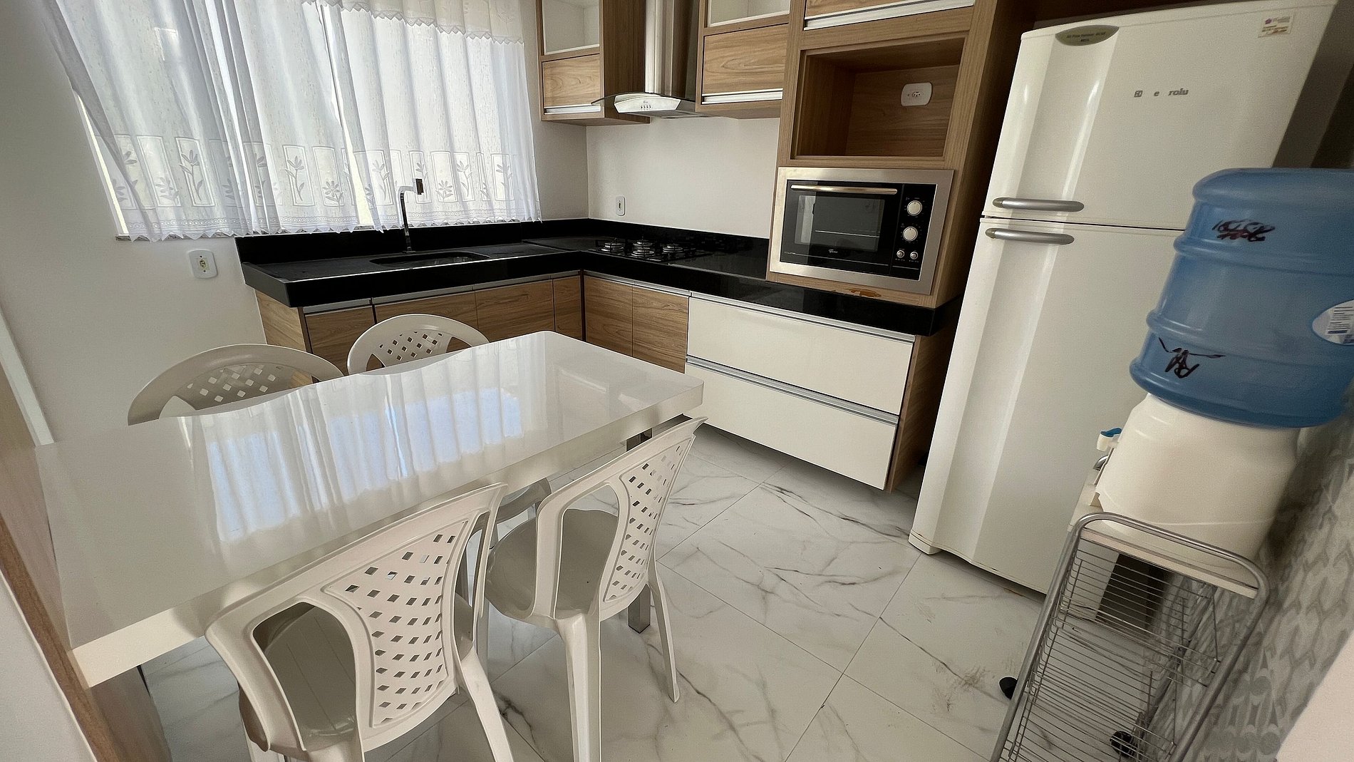 Áreas Sociais: Cozinha completa e sala de estar equipada com Smart TV e mesa de jantar, ideais para refeições e momentos de integração.
