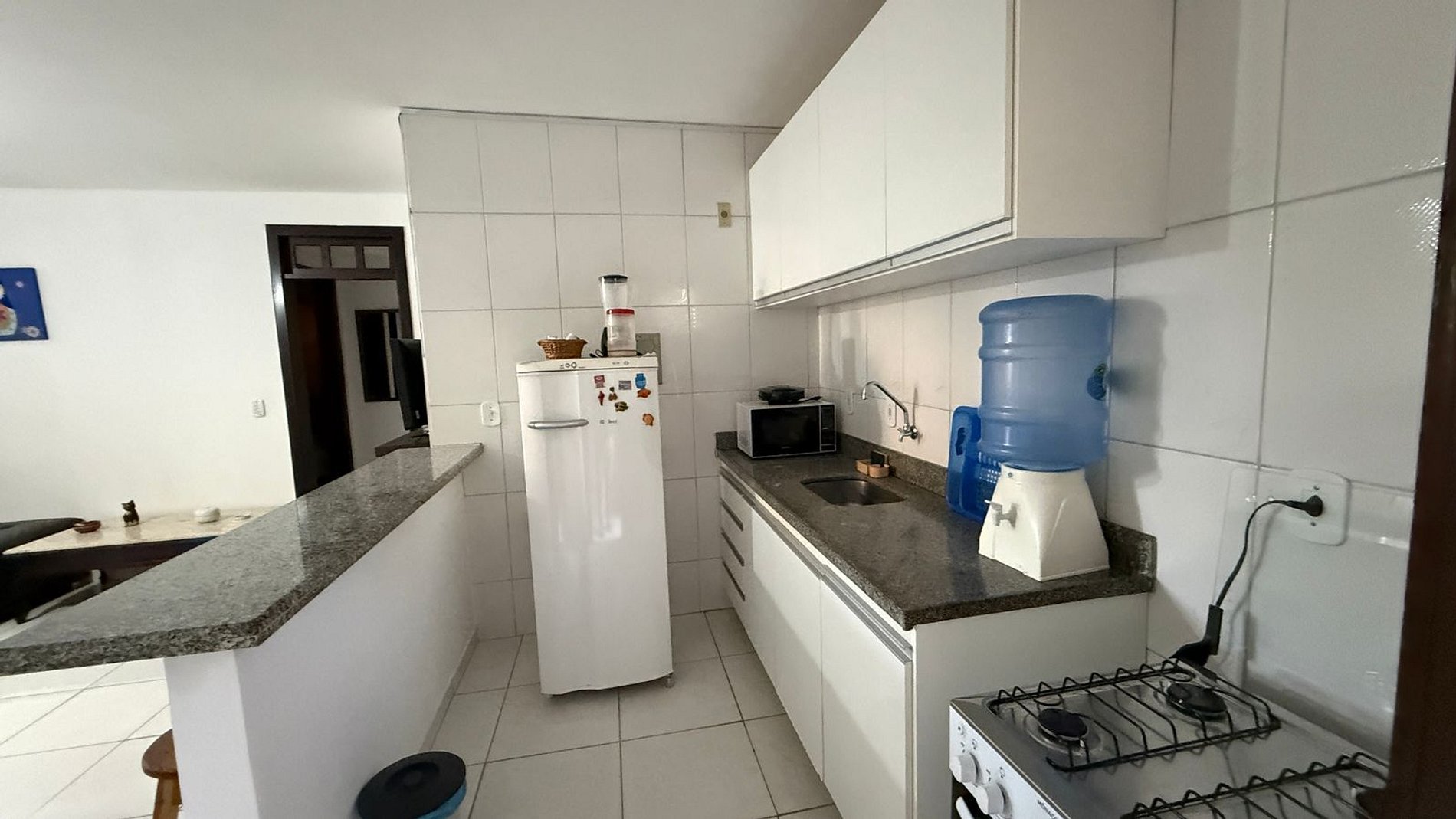 cozinha americana equipada com geladeira, fogão, tanquinho, micro-ondas, utensílios de cozinha e demais itens essenciais para garantir conforto e bem-estar durante a estadia.
