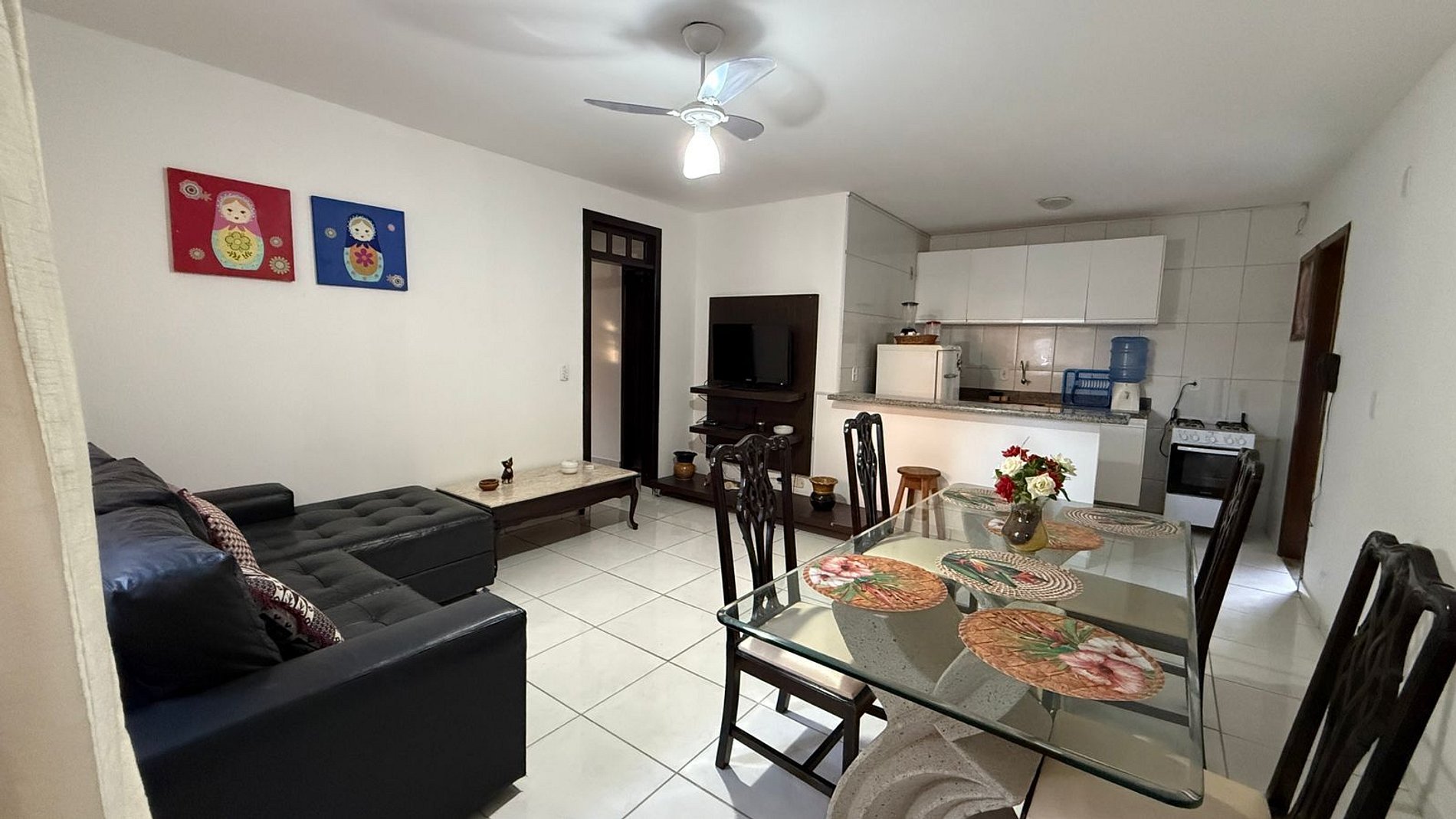 Apartamento com dois quartos, incluindo uma suíte. Dispõe de ar-condicionado, secador de cabelo, banheiro social, sala de TV, internet e cozinha equipada com fogão, geladeira e utensílios.